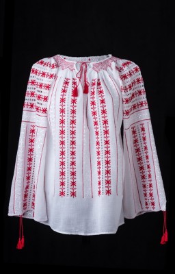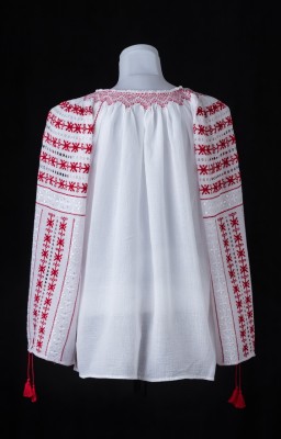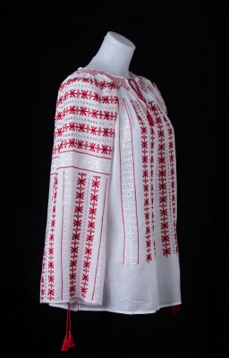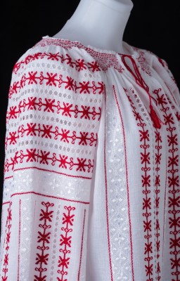 Este o ie bogat brodata cu motive geometrice cusute cu fire rosii si albe pe panza topita din bumbac.